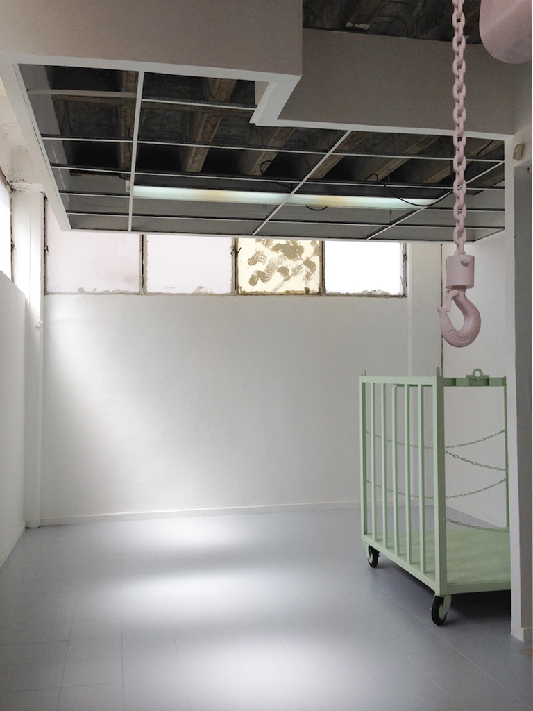 Day by day, for three months, I mainly improvised with what I had at hand, trusting the journey. I decided to keep and transform the neglected objects still in place — like the industrial crane and its cage — and to create a new environment for them. I repainted them in pastel pink and minty green, and as a result, the industrial machines lost their functionalities, becoming absurd objects. I was interested in using painting not as a masking tool, but as an instrument to expose new possibilities. The choice of pastel colours emphasized the irony of the situation, where it made no sense to try to operate huge machines looking like frozen candies.