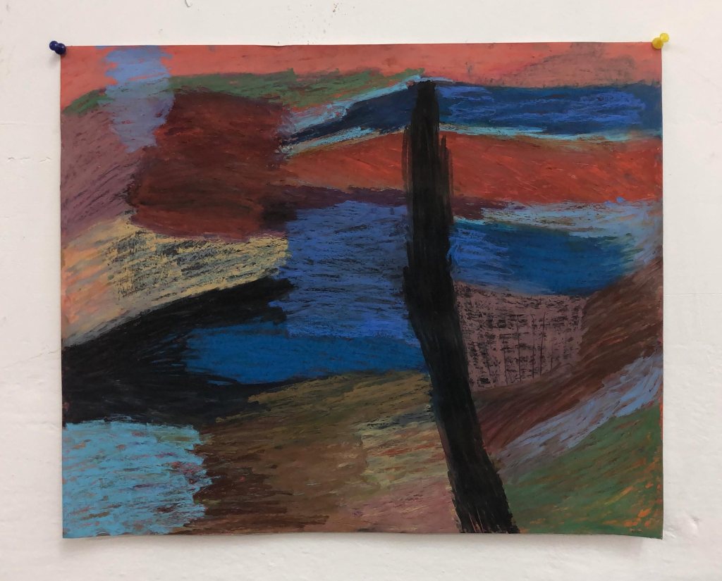 I was struck by the movement in them. I also noted some similarities with my later works, like the colour palettes and the symbolic three characters/shadows which return in my oil paintings (see here). Moreover, and that’s where I am getting jealous at my younger self, I see in them a free expression and a loose gesture. Qualities that I struggle with today.