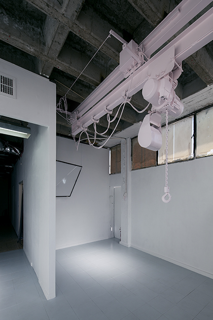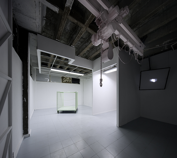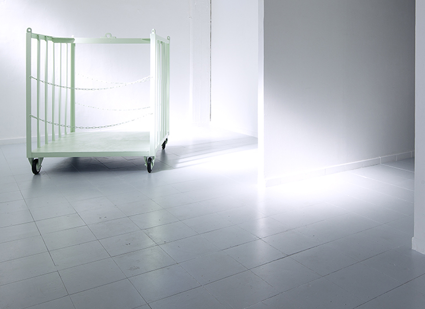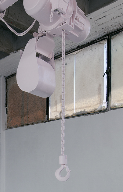 Day by day, for three months, I mainly improvised with what I had at hand, trusting the journey. I decided to keep and transform the neglected objects still in place — like the industrial crane and its cage — and to create a new environment for them. I repainted them in pastel pink and minty green, and as a result, the industrial machines lost their functionalities, becoming absurd objects.